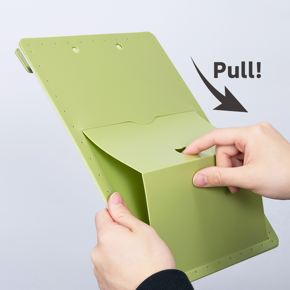 タテコの綴具には、樹脂製全長クリップカバー付きのクリップを採用しています。紙の両端までしっかり押さえるので、「折れ」や「めくれ」を防ぎ、書類を綺麗に保ちます。