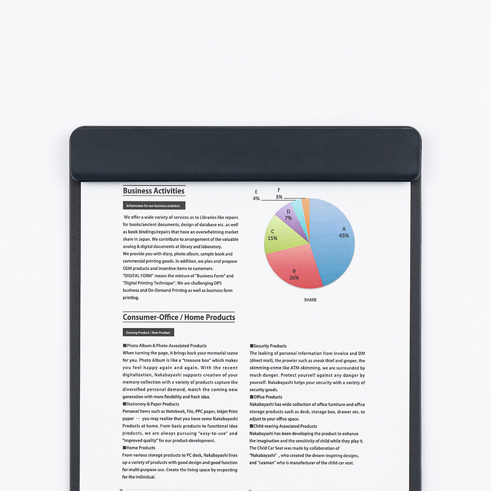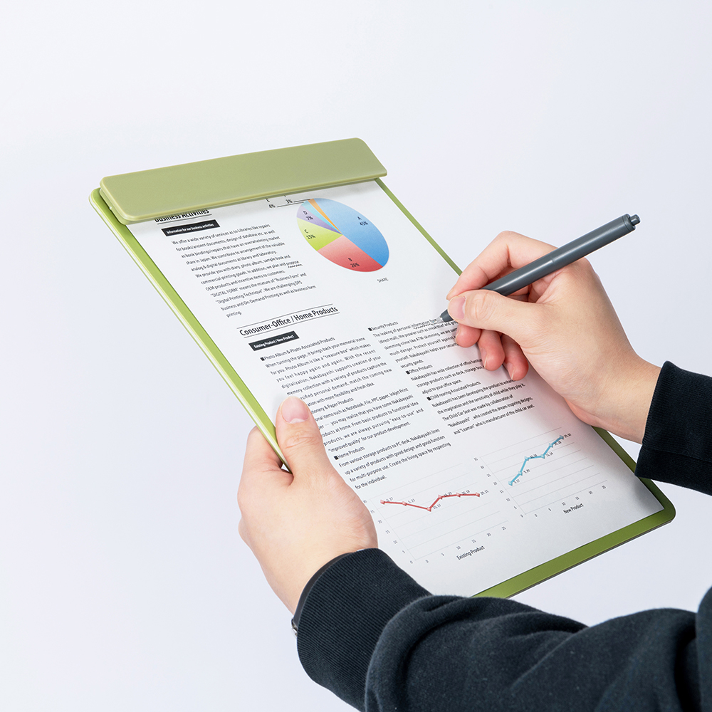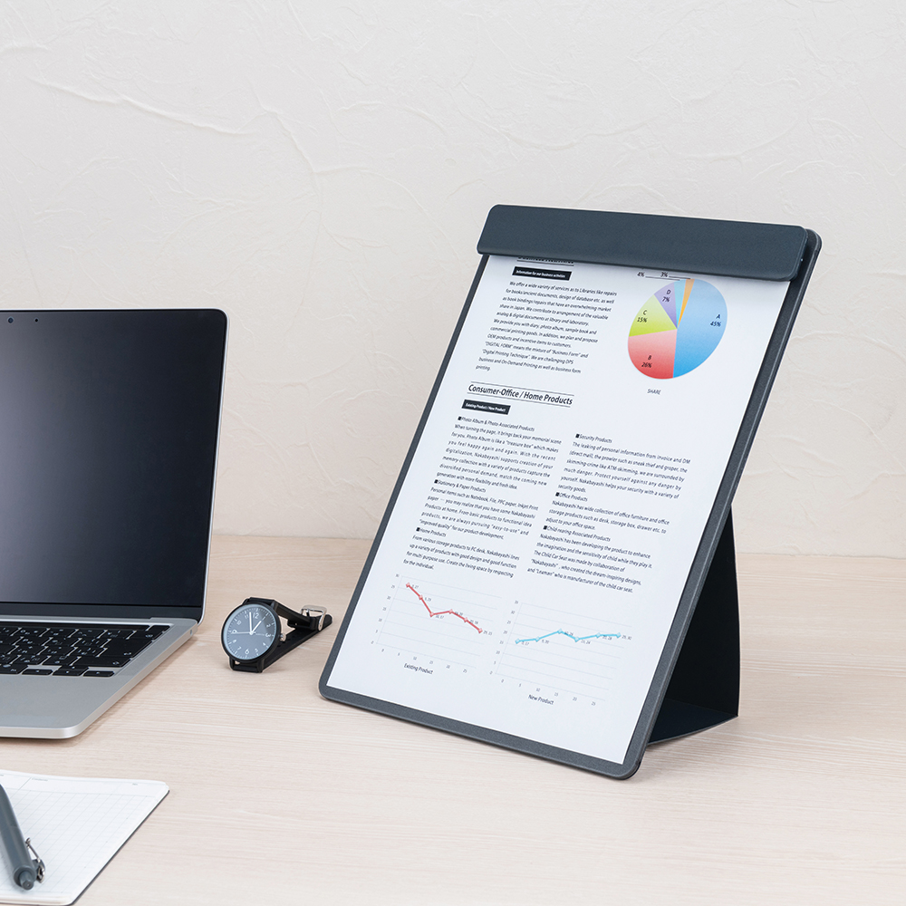 また4.5mmの超極厚ボードを採用しており、立ったままの筆記でもたわみにくく、しっかりと書き込むことができます。説明会やイベントなど机がない場所での筆記や、図面や仕様書などを扱う現場作業などに最適です。