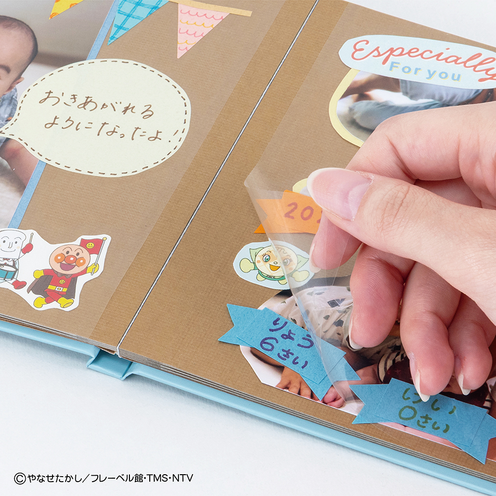 また、カードそれぞれにかわいいアンパンマンのなかまたちのイラストがデザインされており、カードを切り抜いてデコレーション小物としてもご活用いただけます。台紙には、貼ってはがせる高品質のフリー台紙「プラコート台紙」を採用しています。PETでラミネート加工したプラコート台紙は防湿効果に優れており、また写真をフィルムで覆っているため保存性が高く、鮮やかに思い出を保存することができます。