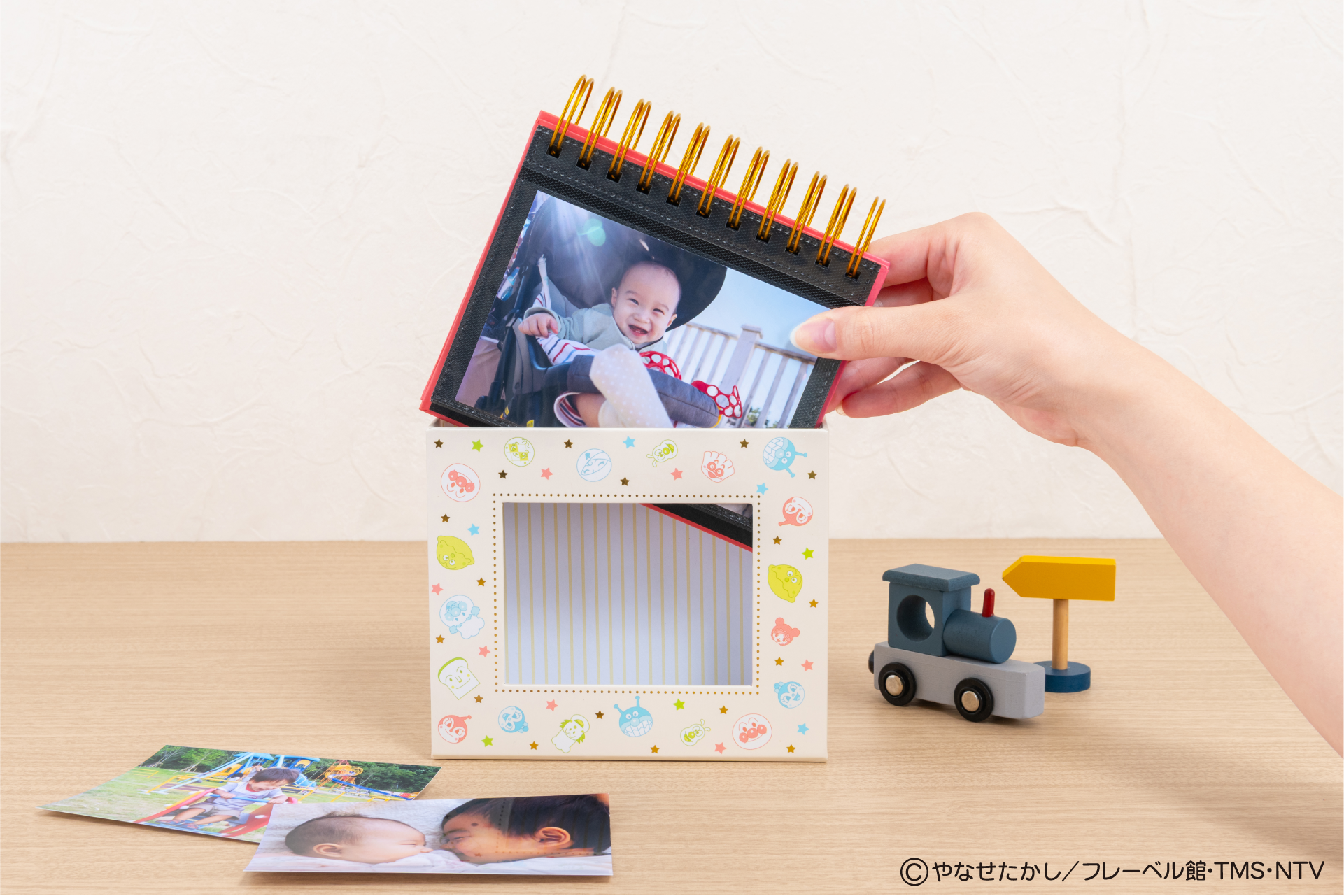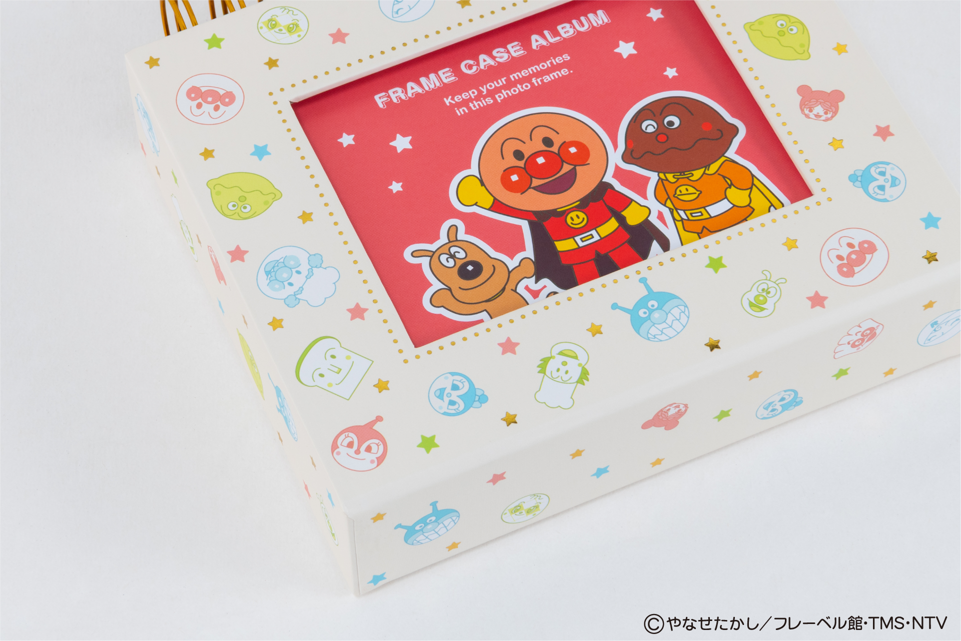「フレームケースアルバム」は、台紙に入れた写真をめくって入れ替えることで簡単に好きな写真を飾ることができる人気のアルバムシリーズです。今回、アンパンマン柄がシリーズに追加されました。ケースには箔押し加工が施されており高級感があるので、お気に入りの写真やお子さまの写真を入れたギフトに最適です。