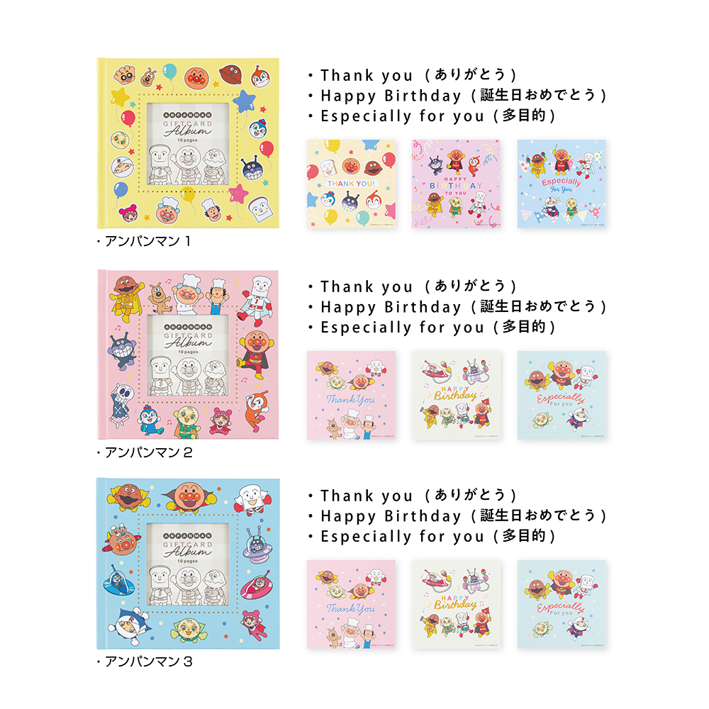 - 贈るシーンに合わせて選べるギフトカード3枚が付属したアンパンマン柄のミニアルバム