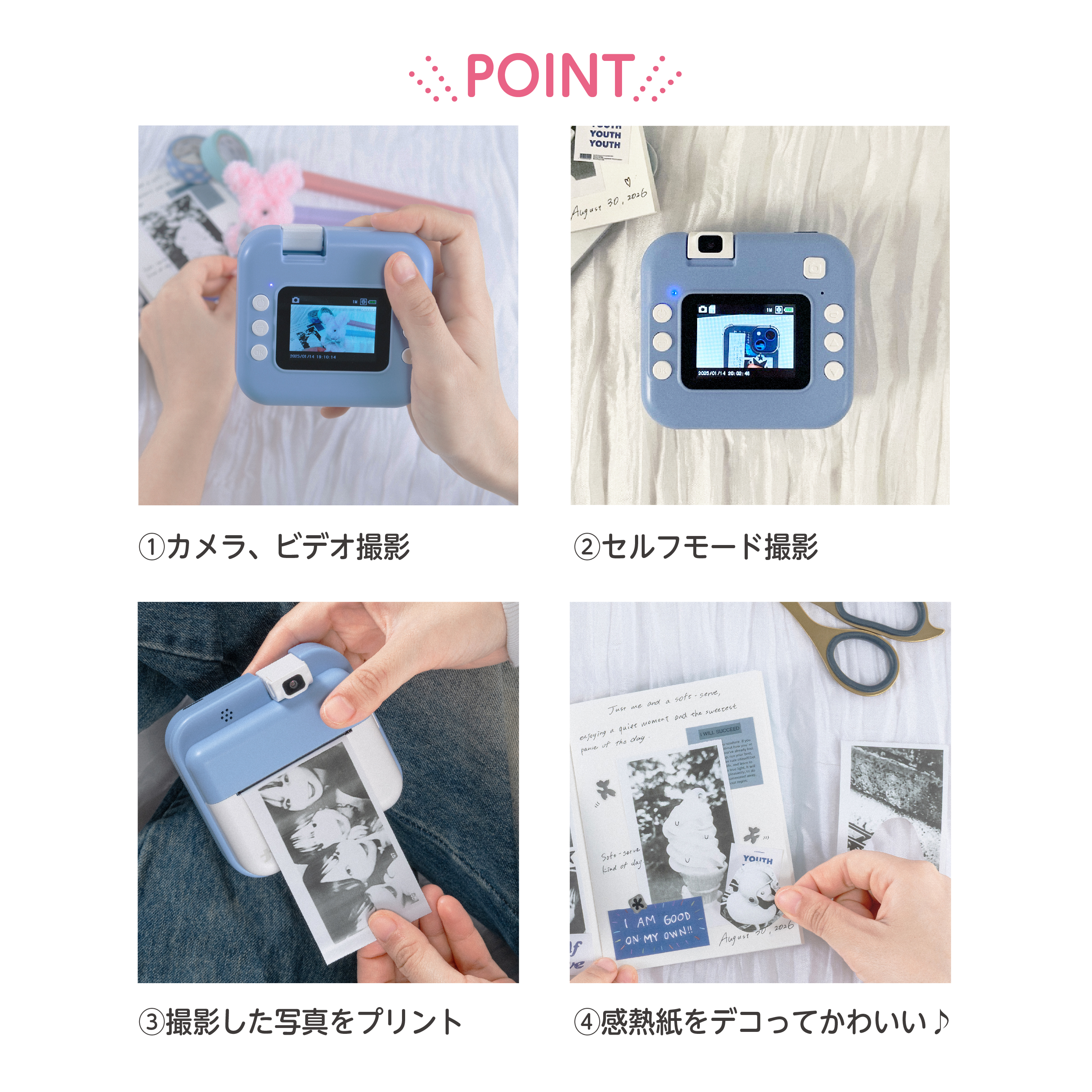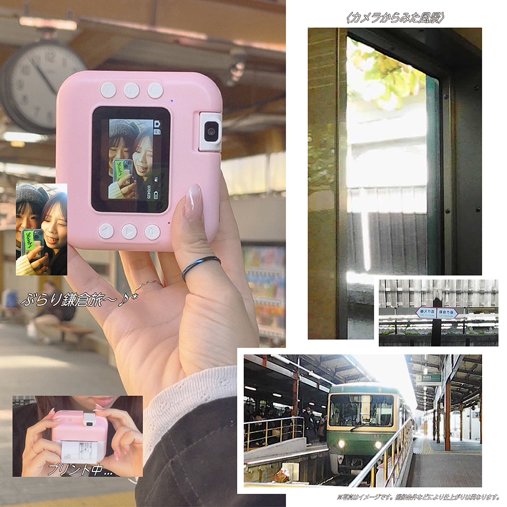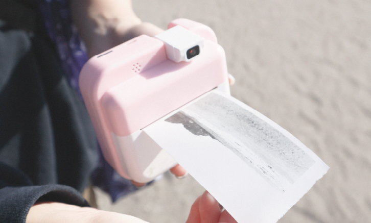- 感熱紙を使用し、インク不要で撮った瞬間をその場でモノクロプリント可能。プリントした写真にはメッセージを書いたり、デコレーションしてノートに貼ったり、そのままプレゼントすることもできます。