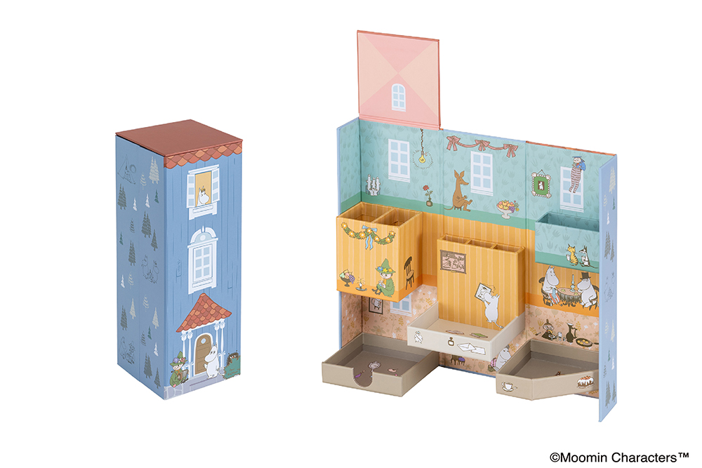ムーミンやしきには、ムーミンやリトルミイ、スナフキンをはじめ、ムーミンの仲間たちが勢ぞろい。箱を開けると内側にも楽しく生活しているキャラクターたちのイラストが散りばめられています。内側のポケットの中にも誰かがひっそりと隠れているかもしれません。ぜひ探してみてください。