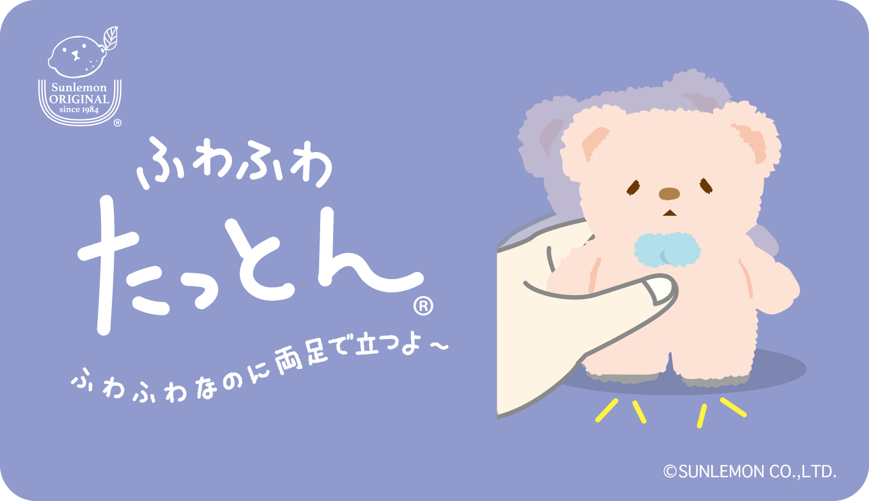 株式会社サンレモンのオリジナル商品。足元のペレットで自立できるぬいぐるみ「ふわふわたっとん ®」SNSでも話題のおっとり癒し系ぬいぐるみシリーズのキャラクターです。 (URL:https://www.sunlemon-original.jp/)