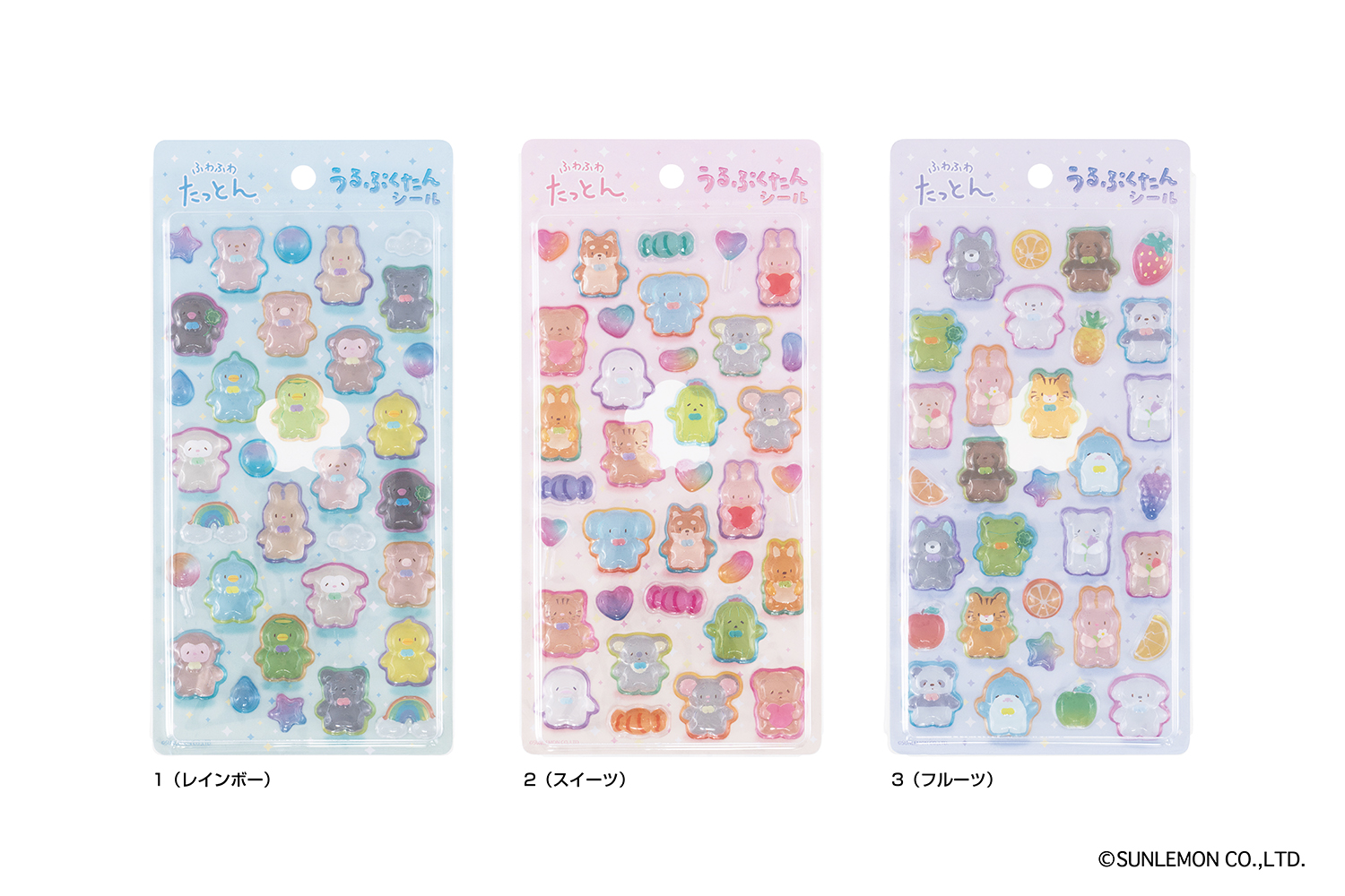 「うるぷくたんシール ふわふわたっとん」はサンレモンの大人気ぬいぐるみのたっとんに、レインボー、スイーツ、フルーツの各モチーフを散りばめた、全3種類のうるうるでぷくぷくなシールです。