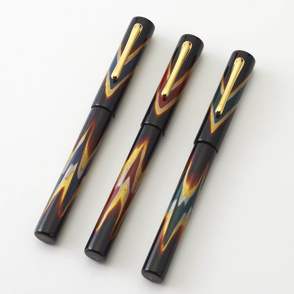 ラインアップは、「富嶽三十六景 凱風快晴」を題材とした「紅土(べにつち)」、「富嶽三十六景 神奈川沖浪裏」を題材とした「濃藍(こいあい)」、「富嶽三十六景 隅田川関屋の里」を題材とした「錆緑(さびみどり)」の3デザイン、ペン先7種類の計21品番です。