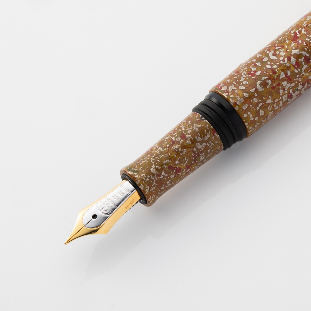 「百工比照」は、加賀藩五代藩主・前田綱紀が各分野の様々な工芸を集めたコレクション資料で重要文化財として指定されています。その資料の中から、武士の刀の鞘に塗られていたおしゃれな表現がルーツとされる漆工芸を万年筆に表現しました。