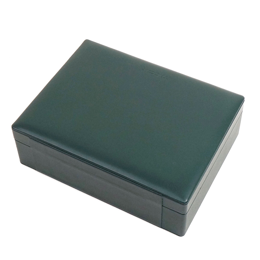 専門店の展示ボックスのような見た目で高級感漂う「コレクションボックス」は、表面に滑らかな手触りのスムース仕上げを施しています。内側の収納部には人工スエードを使用。収納ポケットの両端はスポンジ素材のため、収納したペンを取り出す際はペンの先端を押すとペンが持ち上がり、簡単に取り出せます。カラー展開はブラック(BK)、ブリテッシュグリーン(BG)です。