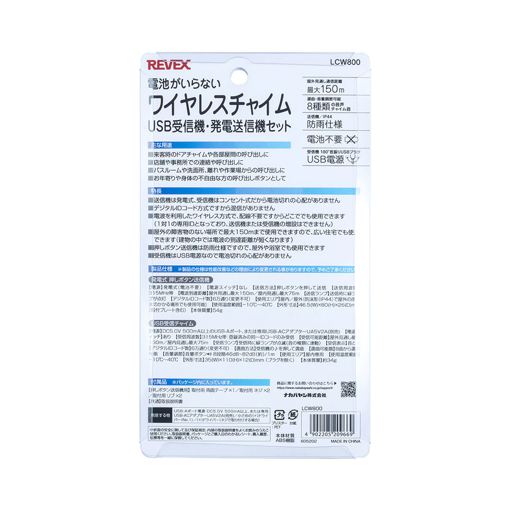 電池がいらないワイヤレスチャイム USB受信機・発電送信機セット