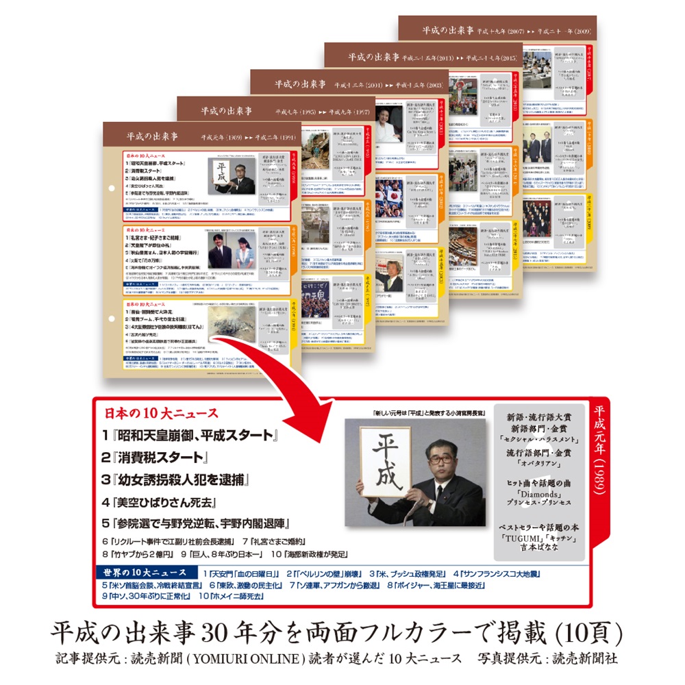 | 仕様 | 平成の出来事10頁 タイトルカード1枚透明袋入り 透明袋カバー付 |