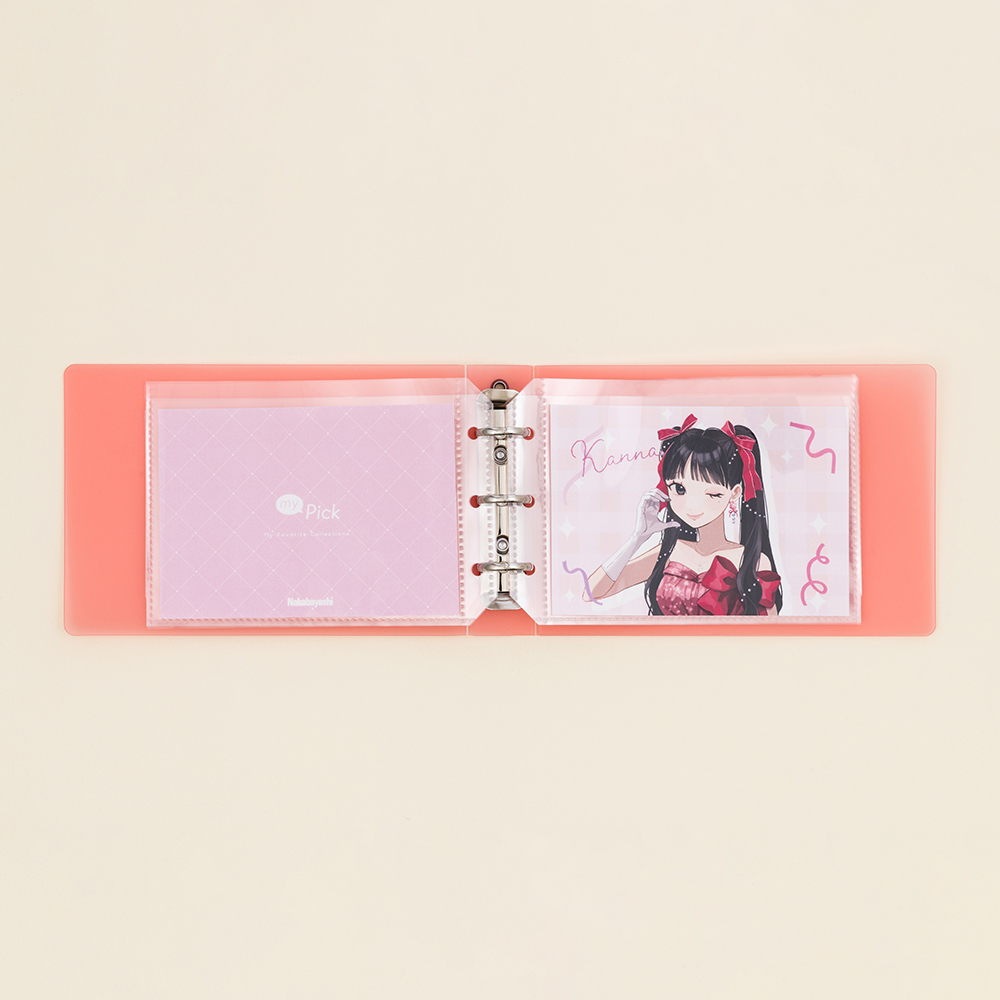 お気に入りの写真やブロマイドを持ち運ぶのに便利なポケットサイズのバインダーアルバムです。内容物が透けて自分好みにカスタマイズができるクリア表紙を採用しました。キーホルダーが付けられるストラップホール付き。