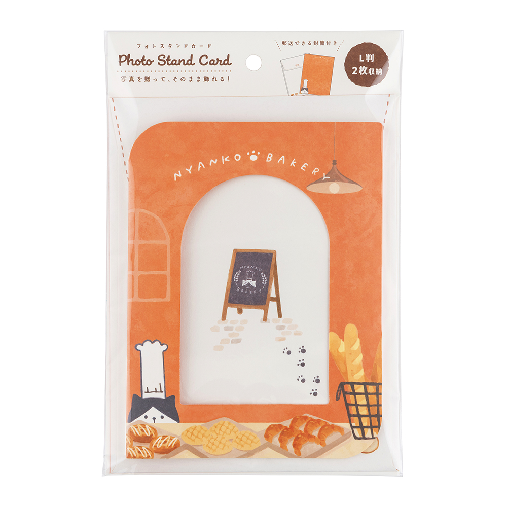 メッセージスペースつきで、厚手の用紙なので、裏写りの心配もありません。カードがそのままフォトスタンドになり、もらったあと、しまわれがちな写真とメッセージカードを飾って長くお楽しみいただけます。サイズはチェキ/L判の計2種類16品番あり、デザインはオリジナルイラストを使用した、(1)ねこ /(2)いぬ /(3)くま /(4)ケーキのどれを選ぶか迷ってしまいそうな可愛い4種類です。