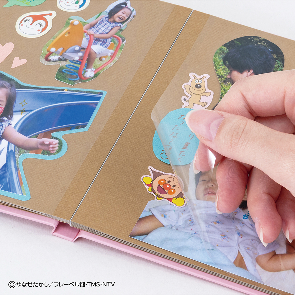 また、カードそれぞれにかわいいアンパンマンのなかまたちのイラストがデザインされており、カードを切り抜いてデコレーション小物としてもご活用いただけます。台紙には、貼ってはがせる高品質のフリー台紙「プラコート台紙」を採用しています。PETでラミネート加工したプラコート台紙は防湿効果に優れており、また写真をフィルムで覆っているため保存性が高く、鮮やかに思い出を保存することができます。