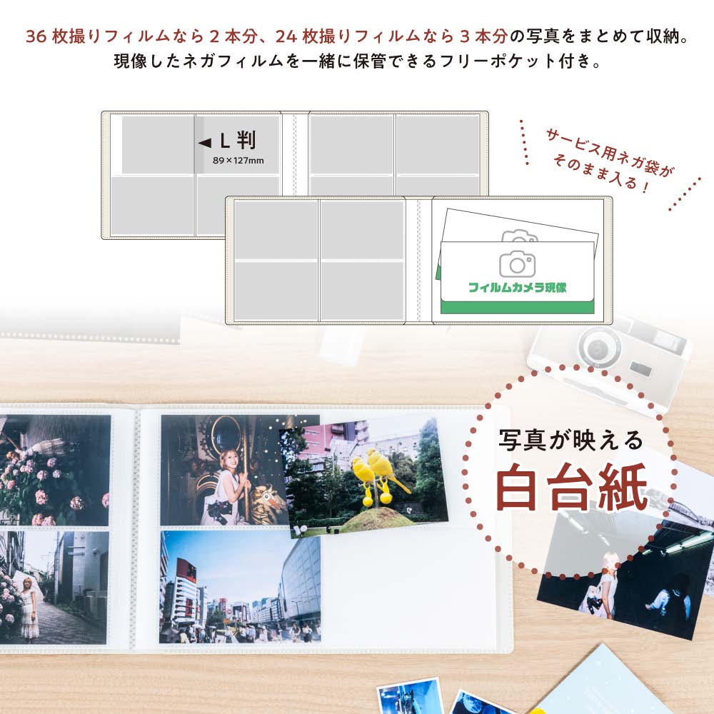 フィルムナアルバム 28は、24枚撮りフィルム1本分の写真がまとまるアルバムです。多めに撮れた場合(※)も安心の28枚収納です。フィルムナアルバム 40は、36枚撮りフィルム1本分の写真がまとまるアルバムで、こちらも40枚収納で、多めに撮れた場合も安心です。