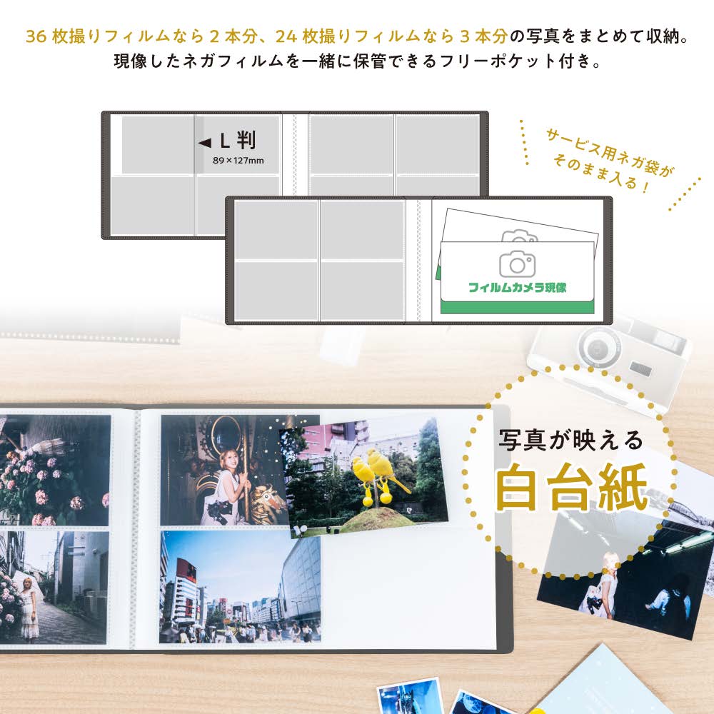 台紙には白台紙を使用しており、写真を引き立たせ、美しく見える仕上がりになっています。ネガフィルムは、白台紙を採用していることで、ネガフィルムの内容が確認しやすくなっています。