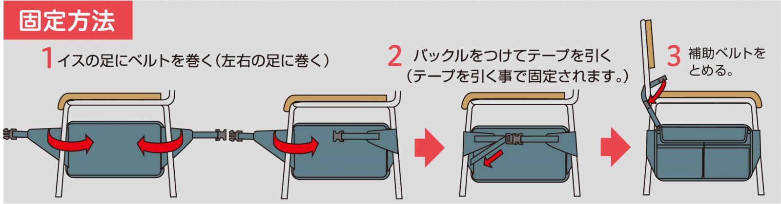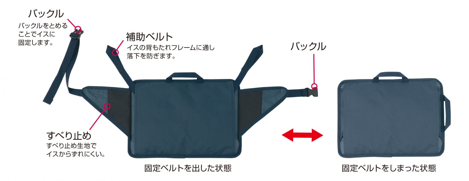 椅子への固定はバックルと補助ベルトでおこないますので、取り外しも簡単です。