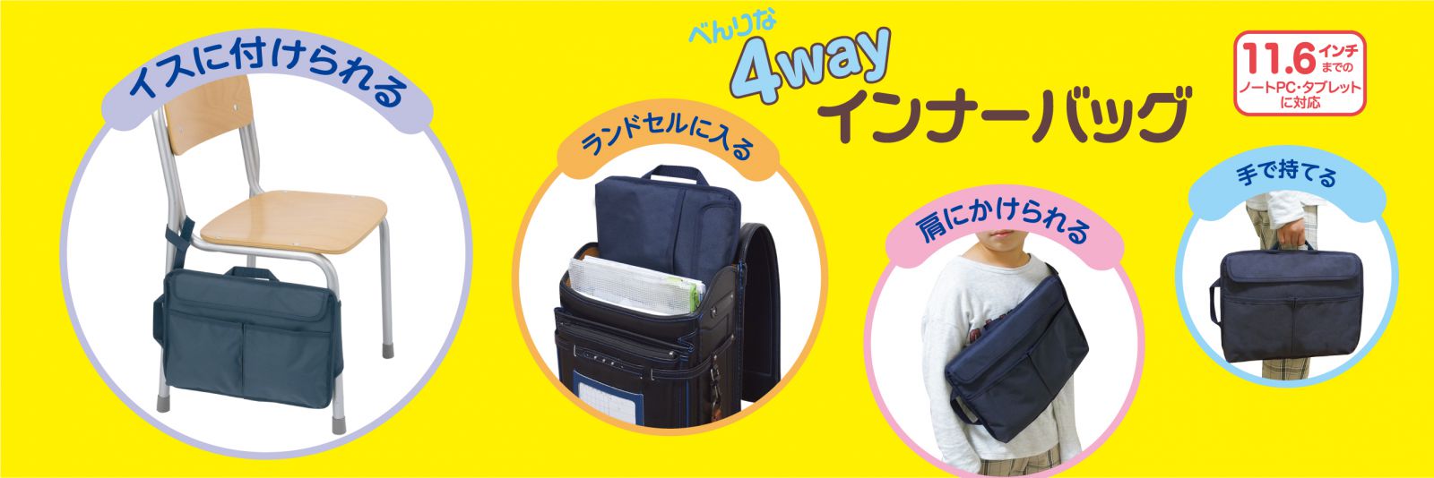 「4wayインナーバッグ」は、学校や塾などでタブレットやPCなど(11.6インチまで)を使用するお子様向けのPC/タブレット収納バッグです。