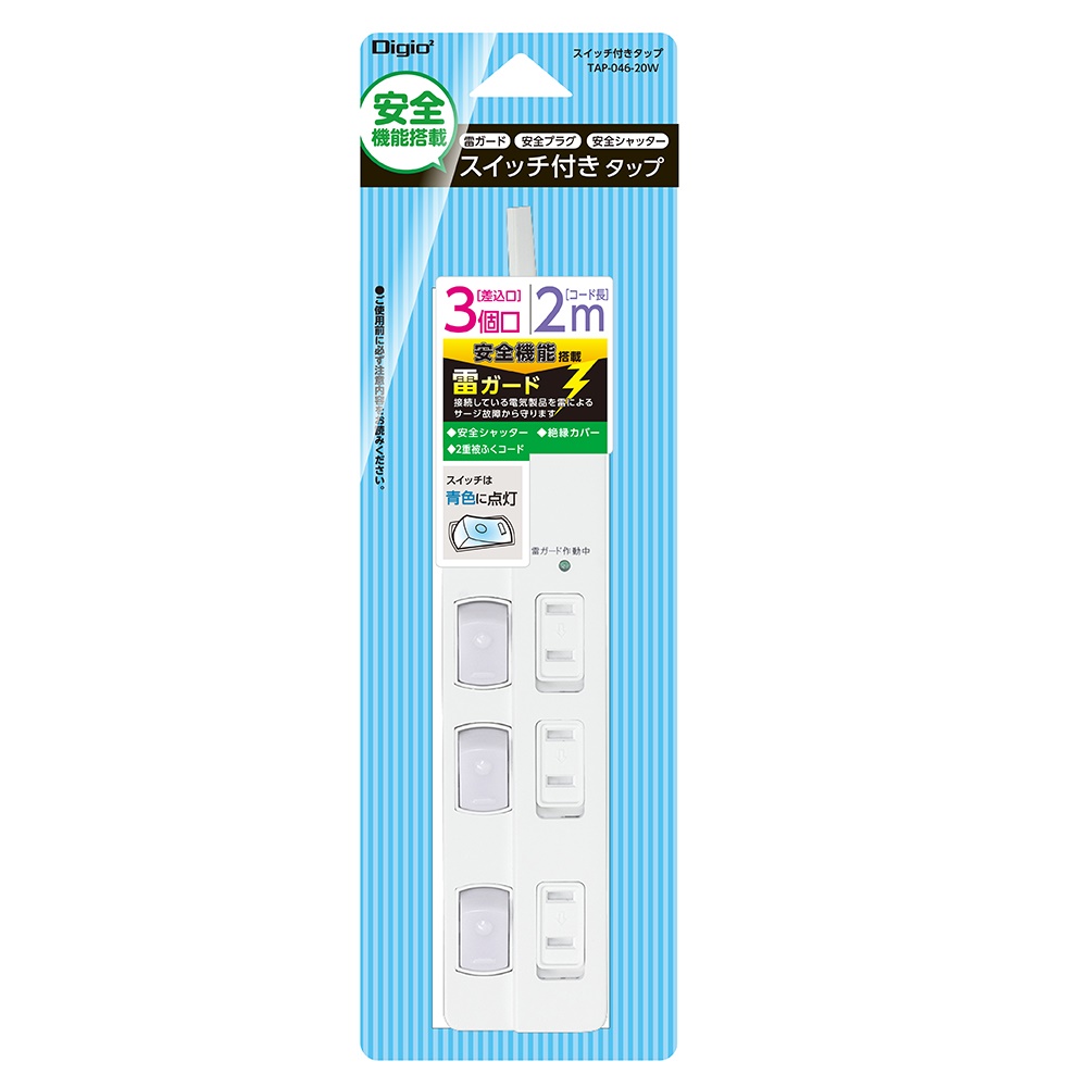 安全機能搭載スイッチ付OAタップ/3個口/2m/ホワイト