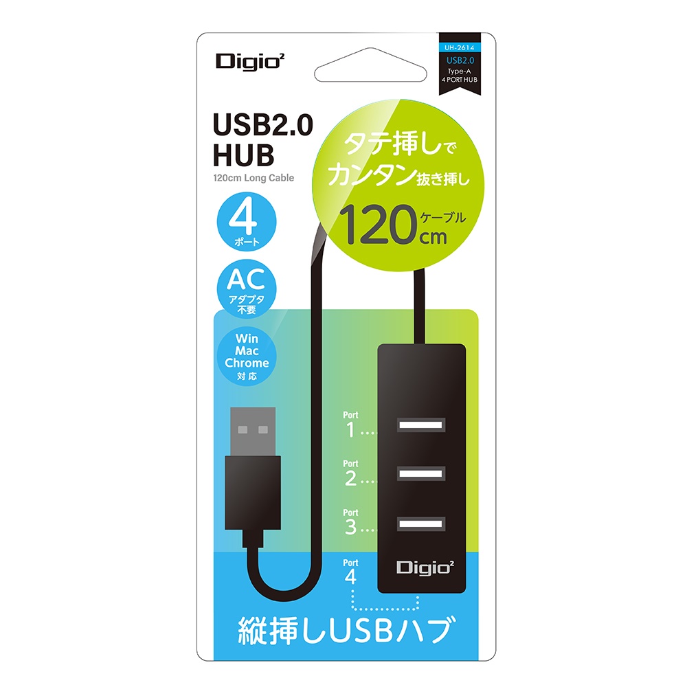 ケーブル一体型4ポートUSBハブ。ロングケーブル120cm。