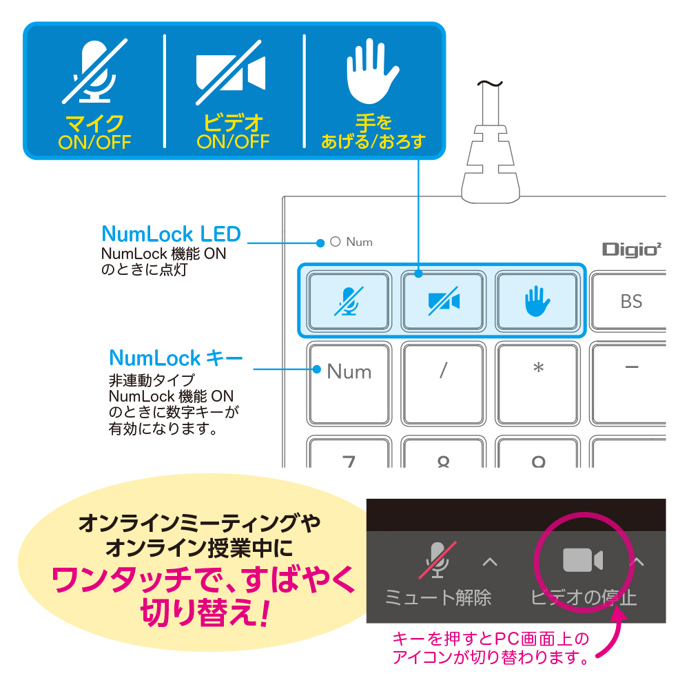 「Zoom対応割り当てキー付きUSB有線テンキーボード」は、Web会議サービス『Zoom』で使える便利な割り当てキーが付いたテンキーボードです。割り当てキーは会議中に頻繁に使う「マイクのON/OFF」、「ビデオのON/OFF」、「手をあげる/おろす」の3つの動作に対応。忘れがちなミュート解除もワンタッチですばやく切り替えることができ、Web会議やオンライン授業でZoomを使用する方に最適です。