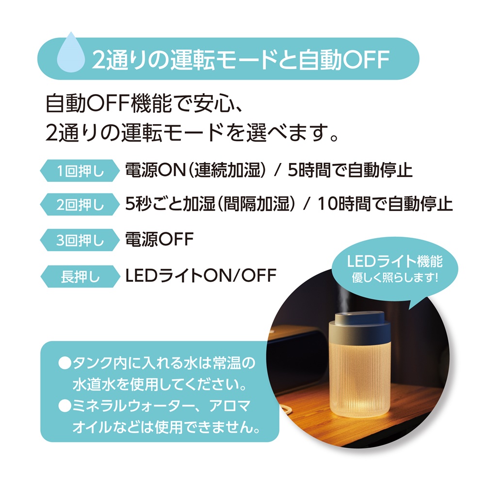 加湿機能は、常時噴霧する「連続加湿」と、5秒ごとに噴霧する「間隔加湿」の2通りの運転モードを選べます。また、自動OFF機能を搭載し、安心してお使いいただけます。