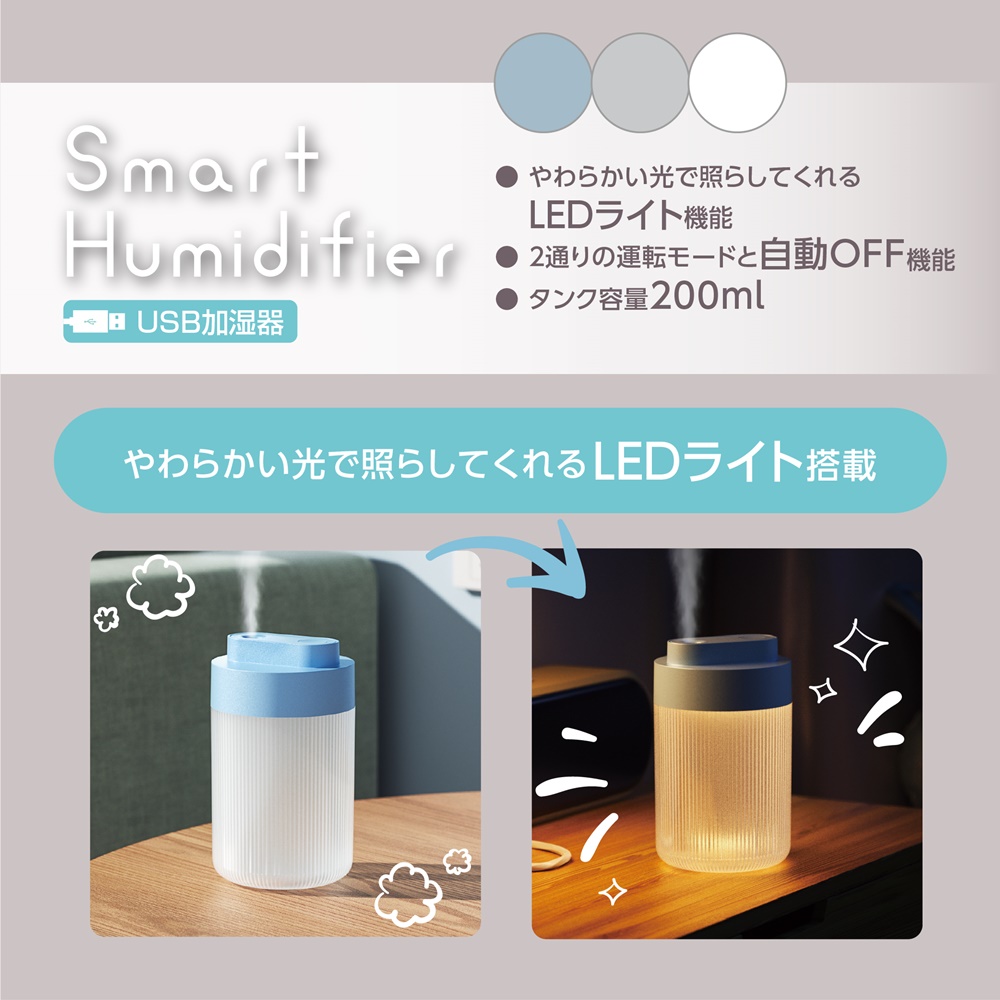 やわらかい光で照らしてくれるLEDライト機能付き。加湿機能を兼ねたインテリアアイテムとしても楽しめます。