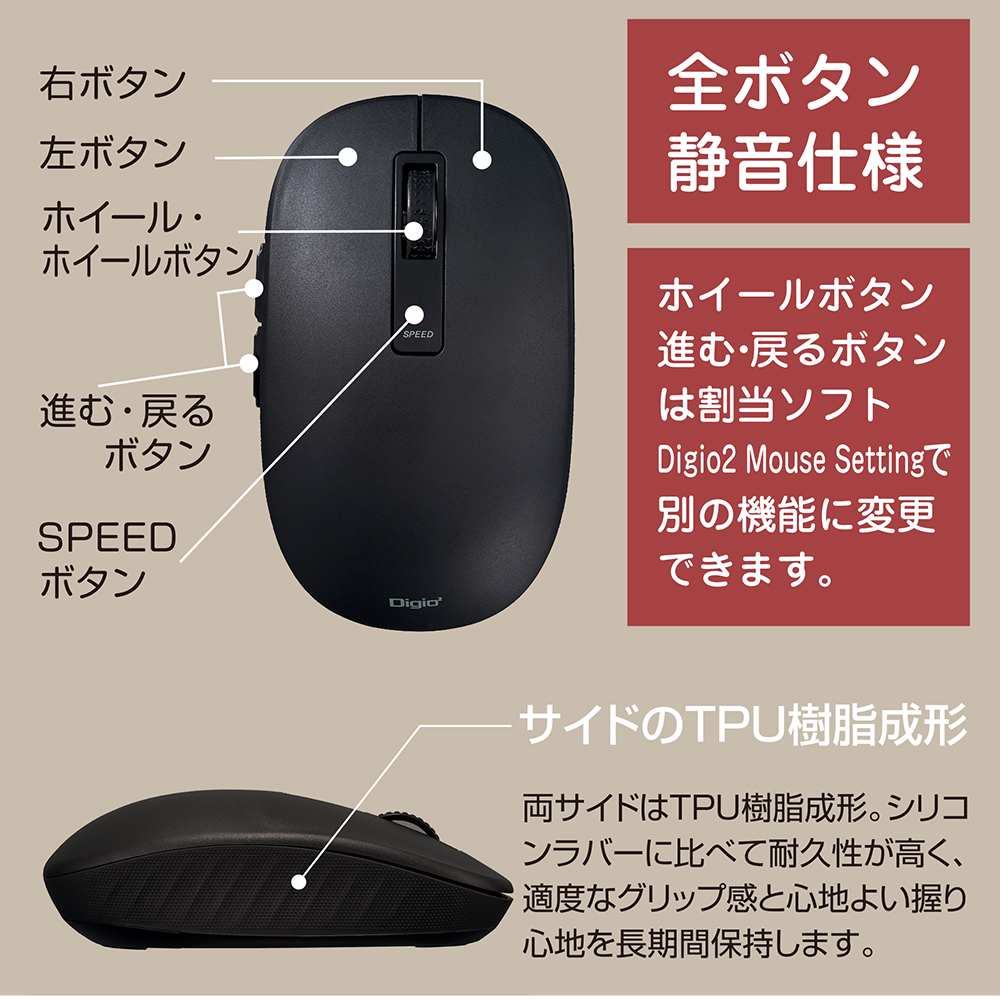 マウスポインタ―の速度を3段階(800dpi→1200dpi→1600dpi)で切り替えられる「SPEEDボタン」、Web閲覧に便利な「進む」「戻る」ボタンを搭載していますので、使用シーンに合わせた操作性を実現しています。