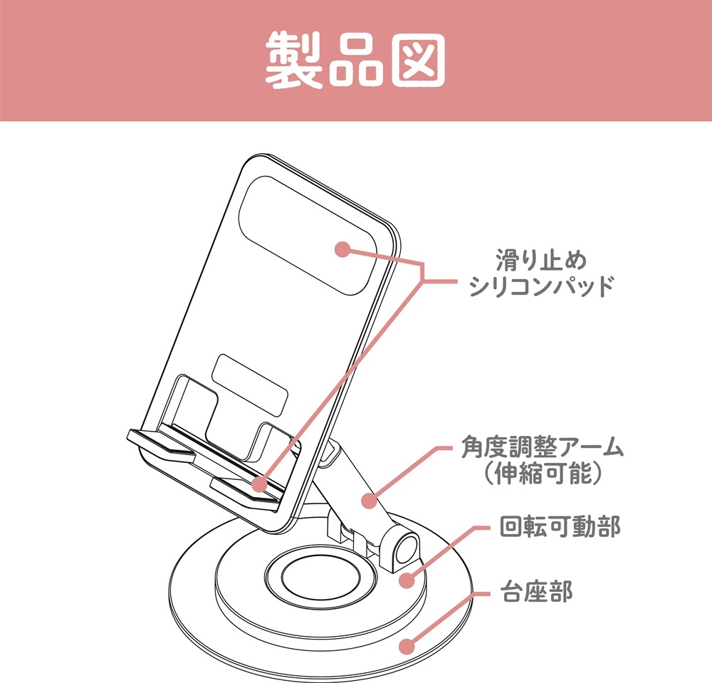 台座部は横方向に360°回転し、伸縮可能な角度調整アームでスタンド本体の上下の高さ、前後を、無段階角度でお好みの高さに合わせて調節ができます。
