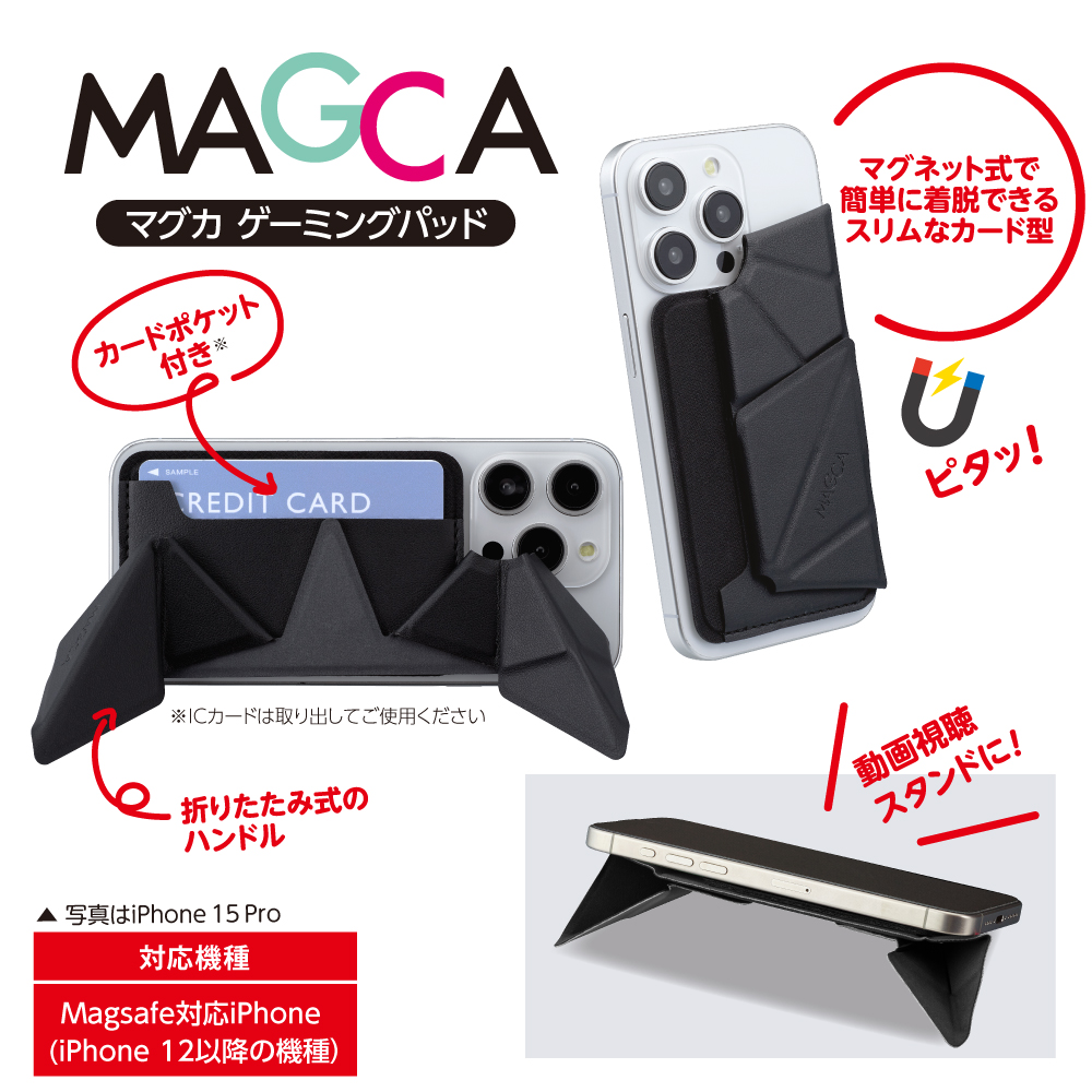 「MAGCA<マグカ>ゲーミングパッド」は折りたたみ式のハンドルがついており、iPhoneをコントローラーのように握ることができます。ハンドルを展開させて角度をつけることもできるのでスタンドとしても利用可能です。またカードポケットも1つついており、よく使用するクレジットカードや身分証を収納できます※。