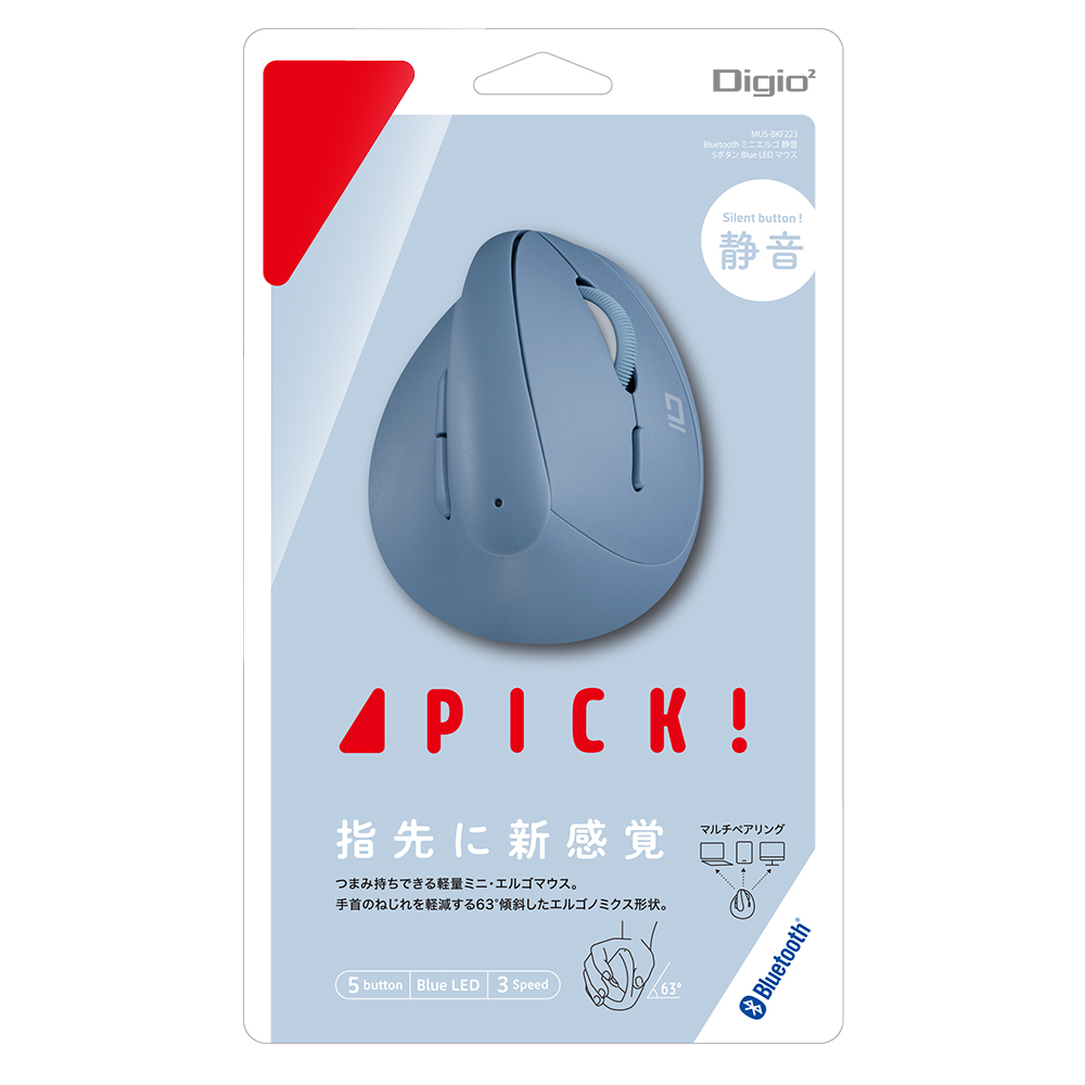 「【PICK!】ミニエルゴ静音5ボタンBlueLEDマウス」は約63°傾斜させた形状で、手首のねじれを軽減するエルゴノミクスタイプのマウスです。従来の当社製品に比べ、約80%のつまみ持ちできるサイズまで小型、軽量化しました。指先で操作する新感覚のマウスです。全ボタン静音仕様で周囲の環境を気にせずご利用いただけます。