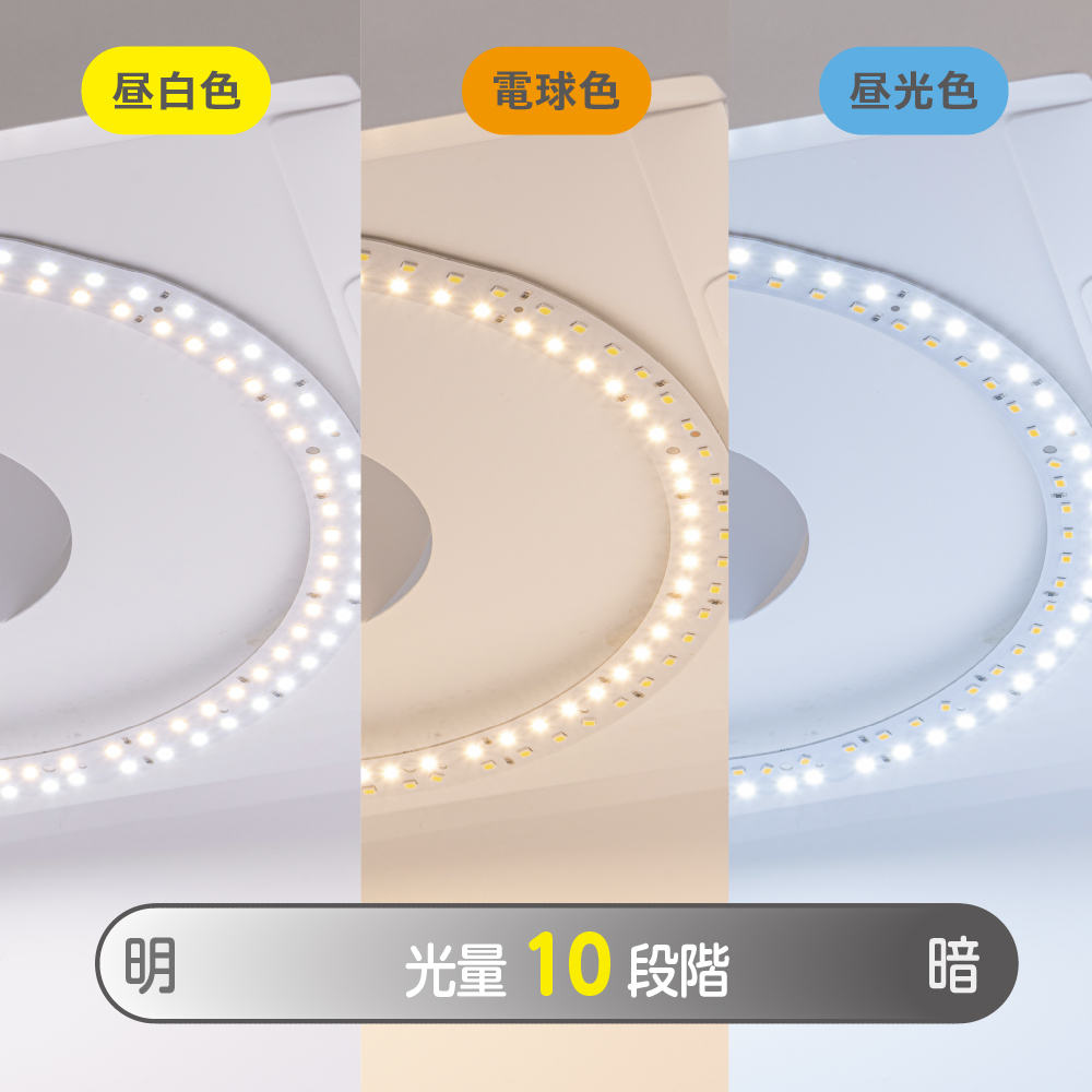 リモコンで操作ができ、光の色は3種類(昼白色・電球色・昼光色)から選べます。