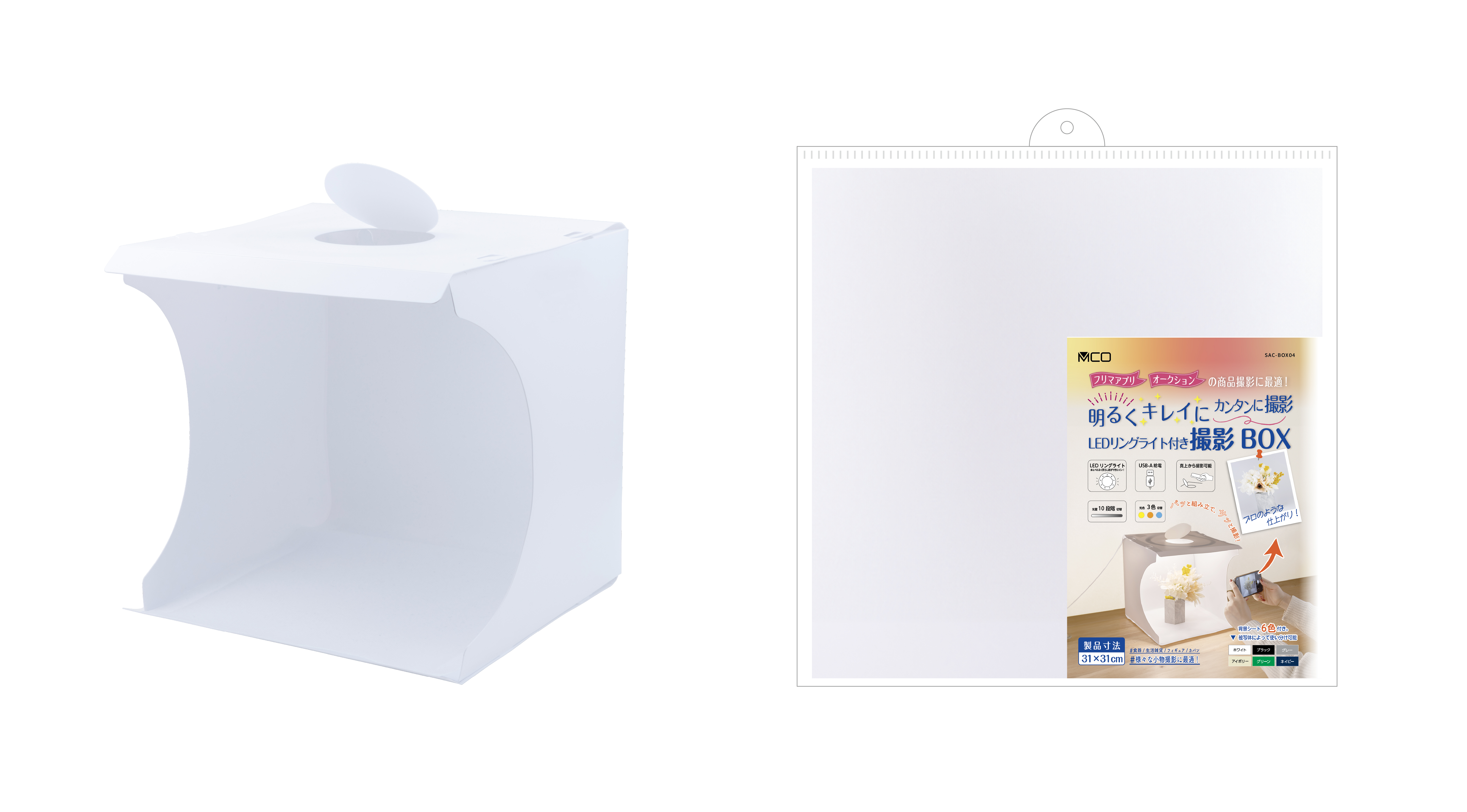 「LEDリングライト付き撮影BOX」は、手軽に小物をきれいに撮影することができる組み立て式の撮影BOXです。