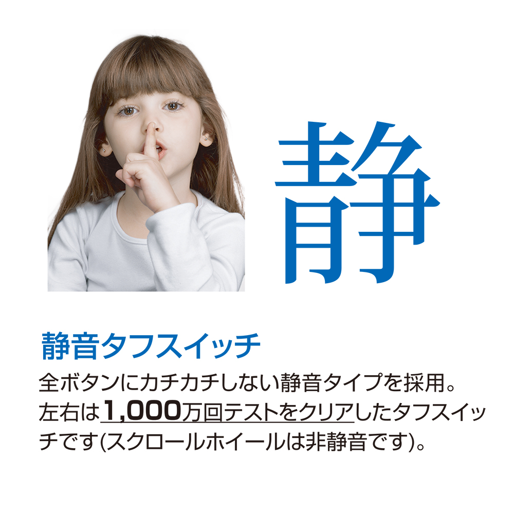 全ボタンにカチカチしない静音タイプ。左右は通常の10倍となる1,000万回の耐久テストをクリアしたスイッチです。