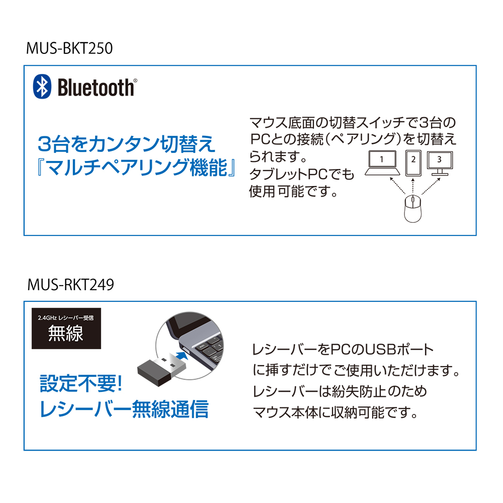 - Bluetooth通信とレシーバー通信2種類の無線通信。Bluetooth通信は3台の機器を切り替えられるマルチペアリング仕様