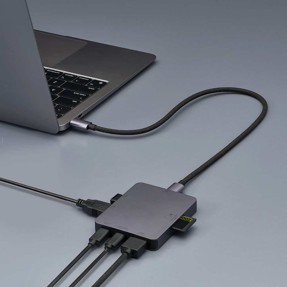 | インターフェース ダウンストリーム側(接続機器側) | Type-C 3.2Gen2ポート×1 Type-A 3.2Gen2ポート×2 Type-C(充電専用)ポート×1 HDMIタイプA(最大4K60Hz)ポート×1 SD×1 microSD×1 ※全てのType-Cポートは、 Alternate Modeには対応していません。 |