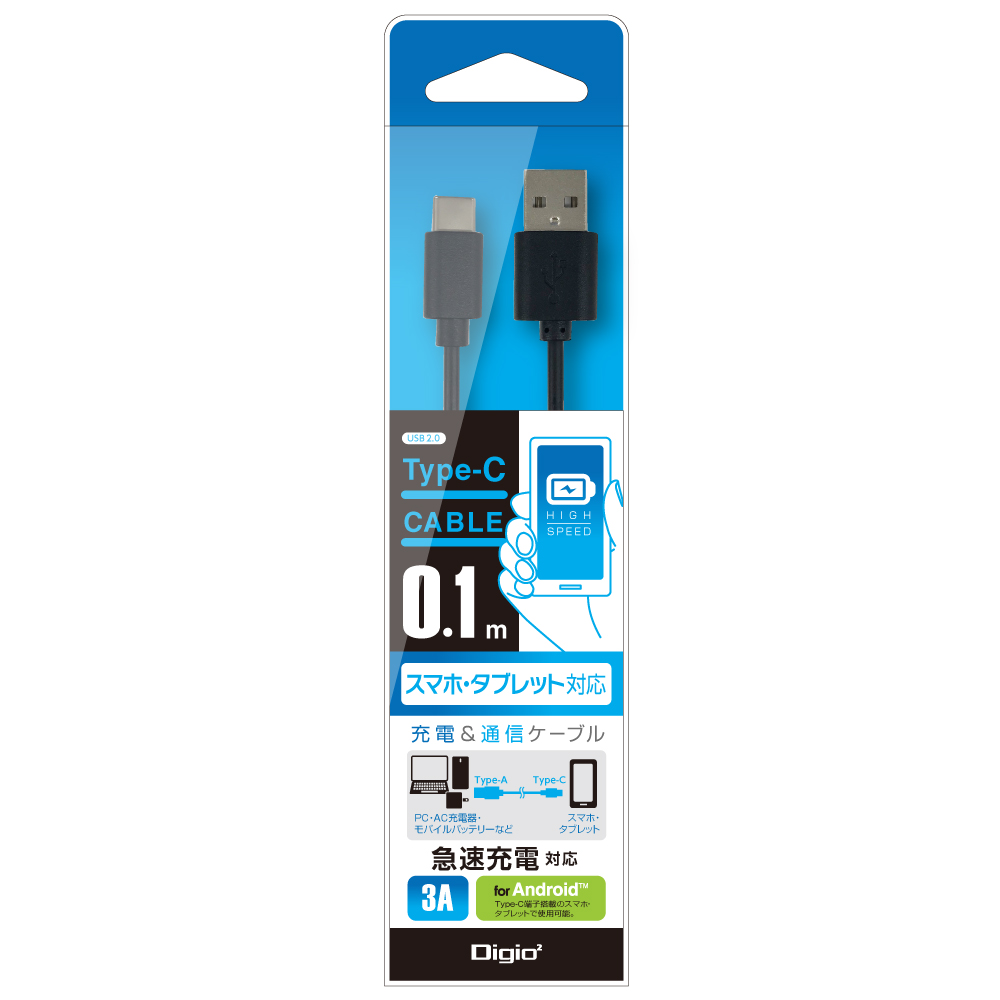 3A対応 スマートフォン・タブレット用 Type-C ケーブル/0.1m ブラック