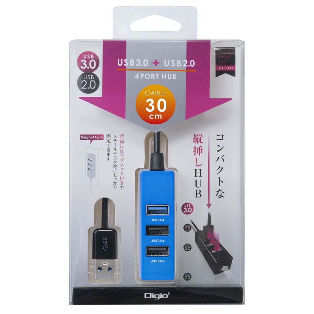 コンパクトな縦挿し4ポートハブ。1ポートはUSB3.0として使えます。底面マグネット付き。