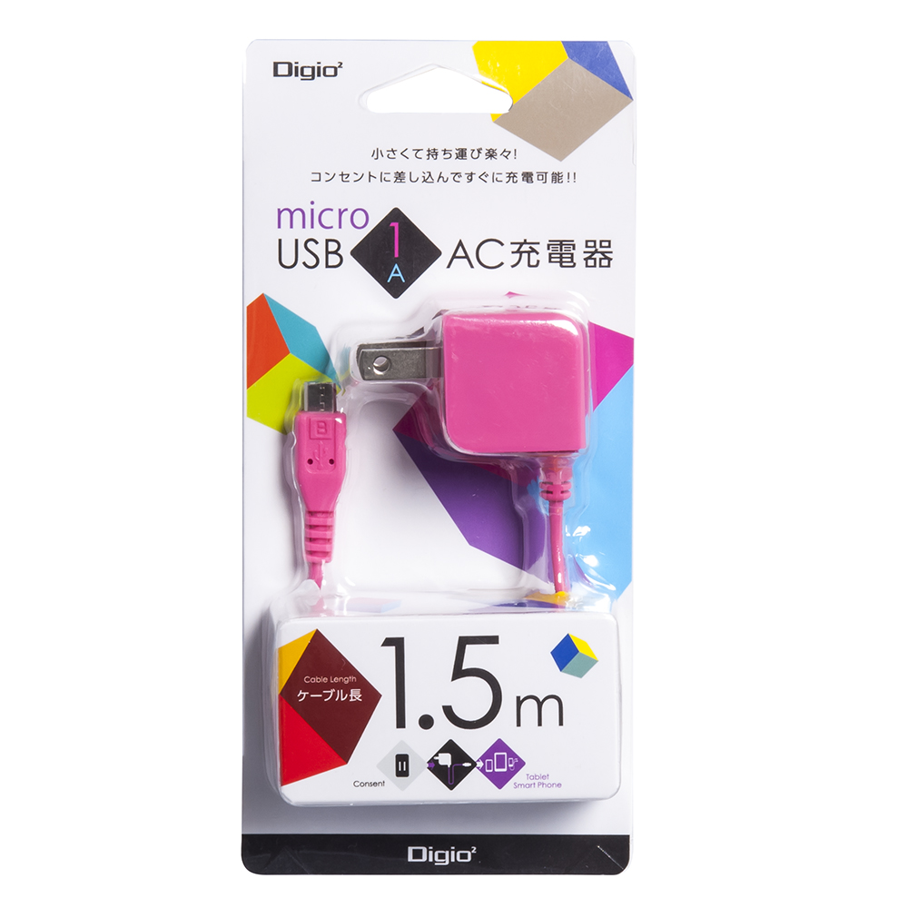 1.5mケーブルでコンセントからスマートフォンやタブレット等を簡単に充電できるコンパクトなmicroUSB充電器です。
