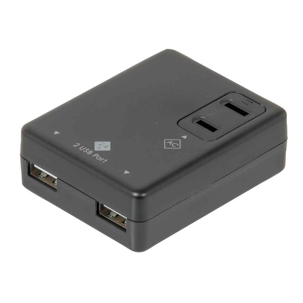 AC電源ポートが1個ついたUSB充電器です。AC使用と同時にUSB2ポート2.4Aでスマホやタブレット等を急速充電可能です。