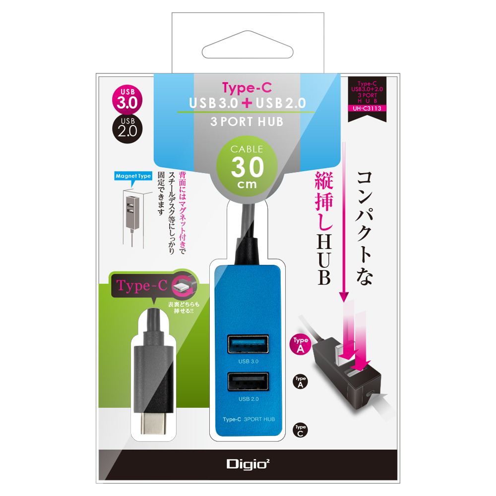 コンパクトな縦挿し Type-C/USB3.0+2.0/3ポートハブ【UH-C3113シリーズ】ブルー