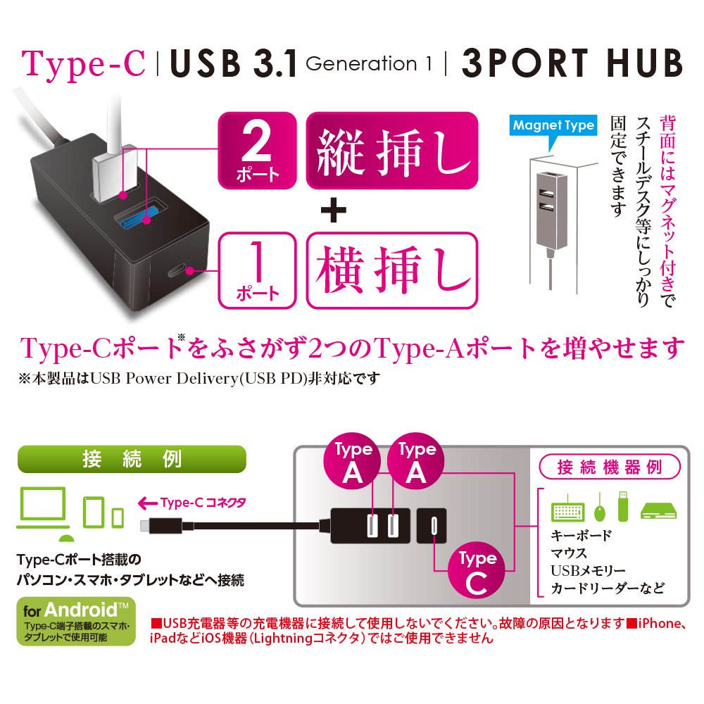Type-Cコネクタポートを搭載した3ポートハブ