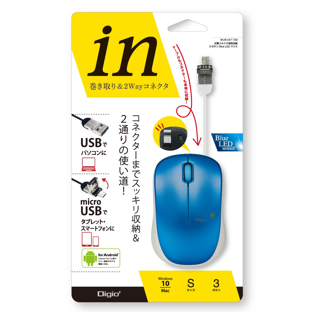 ケーブルもコネクタも本体に巻取収納!ケーブルを必要な長さだけ引き出して使えるので、快適に操作できます(最長70cm)。また、コネクターまでマウス本体に収納でき、持ち運びにも便利です。