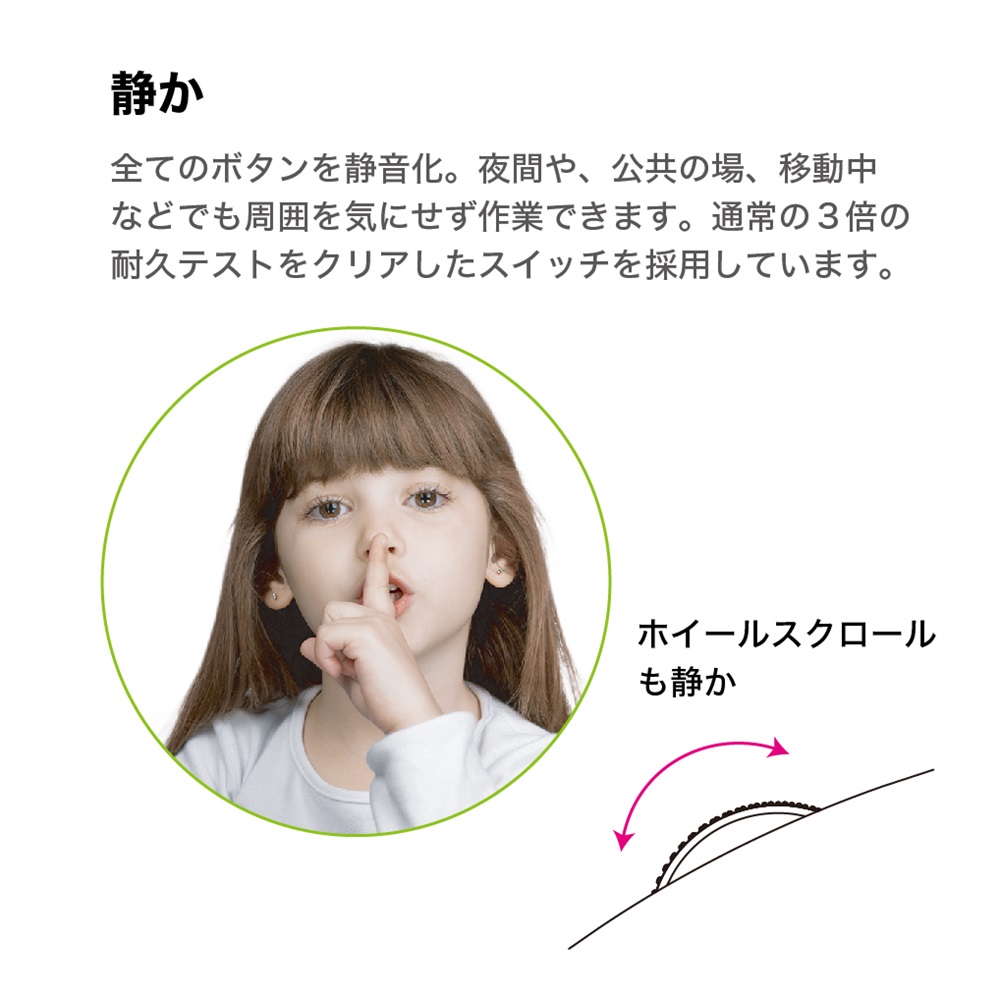 カチカチしない静音ボタン採用。ホイールスクロールも静音です。