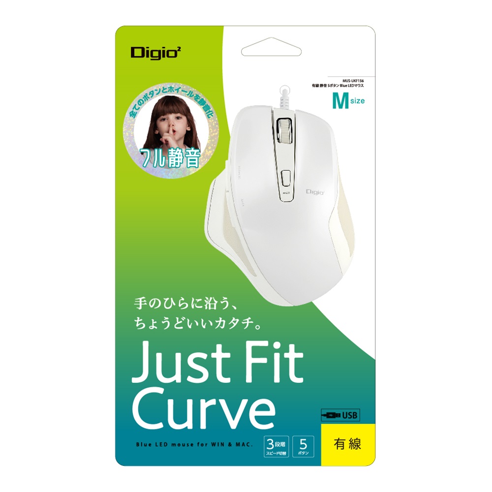 手にフィットするカーブボディ。有線静音5ボタンBlueLEDマウス ホワイト