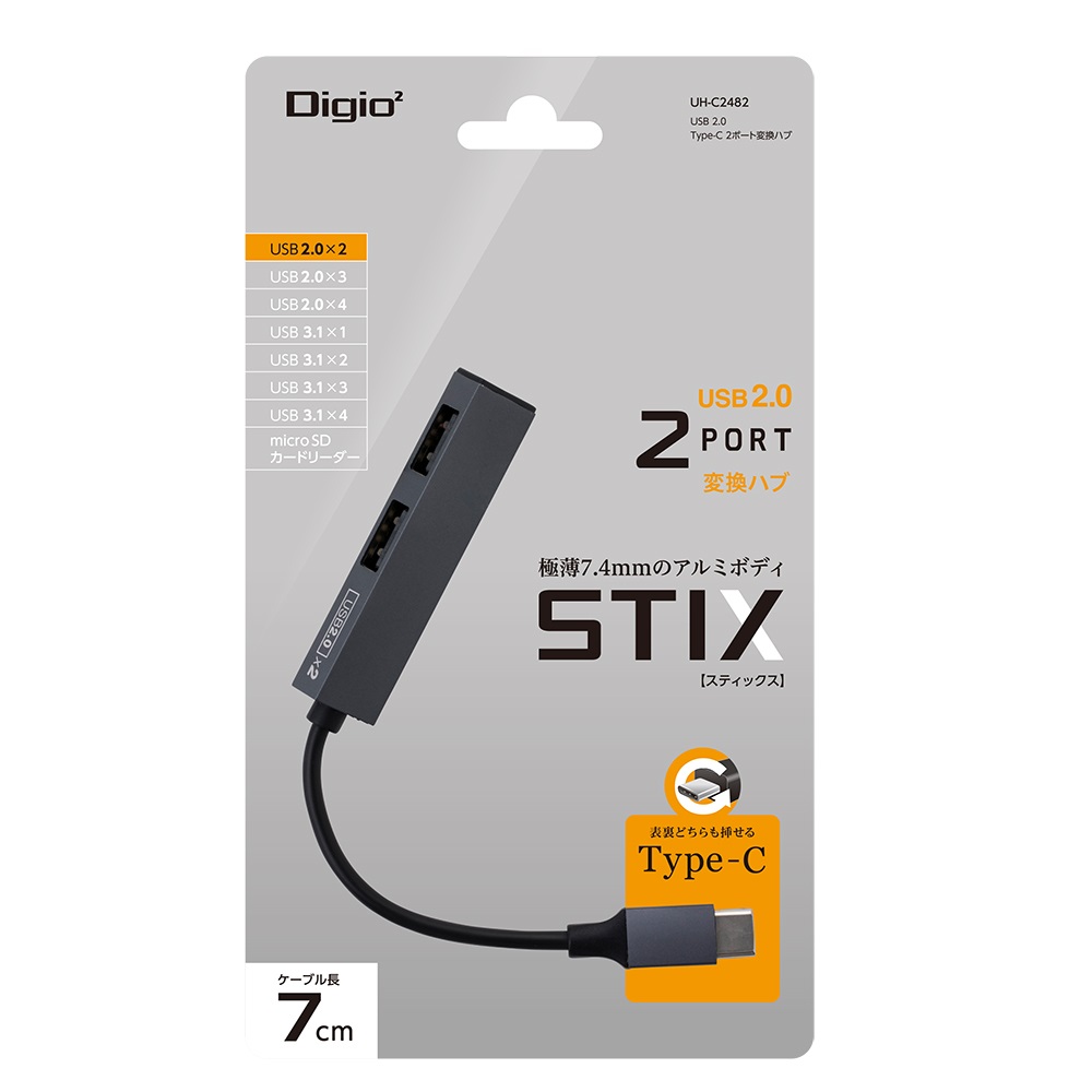 アルミ極薄USBハブ【STIX ®】シリーズ USB2.0 Type-C変換2ポートハブ/グレー