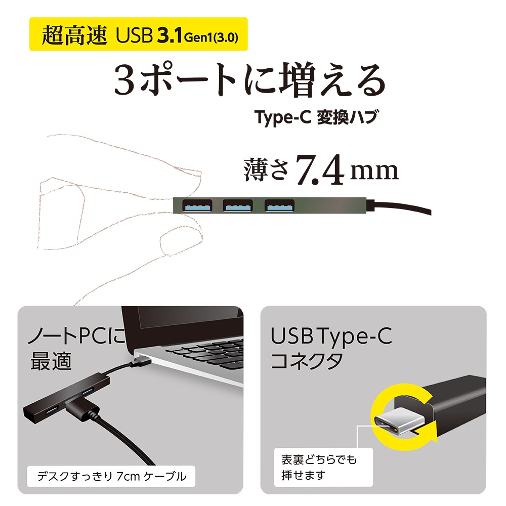 変換USBハブ。PCのポート数を増やしながらUSB機器(Type-A)を接続できます。