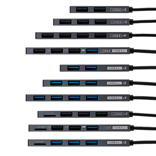 「Digio2 USB変換ハブシリーズ STIX(スティックス)」は、USB規格(UBS2.0・3.1Gen1)の種類や接続ポート数・micro SDカードリーダーの有無など、使用ニーズに合わせた計10種(※)からお選びいただけます。