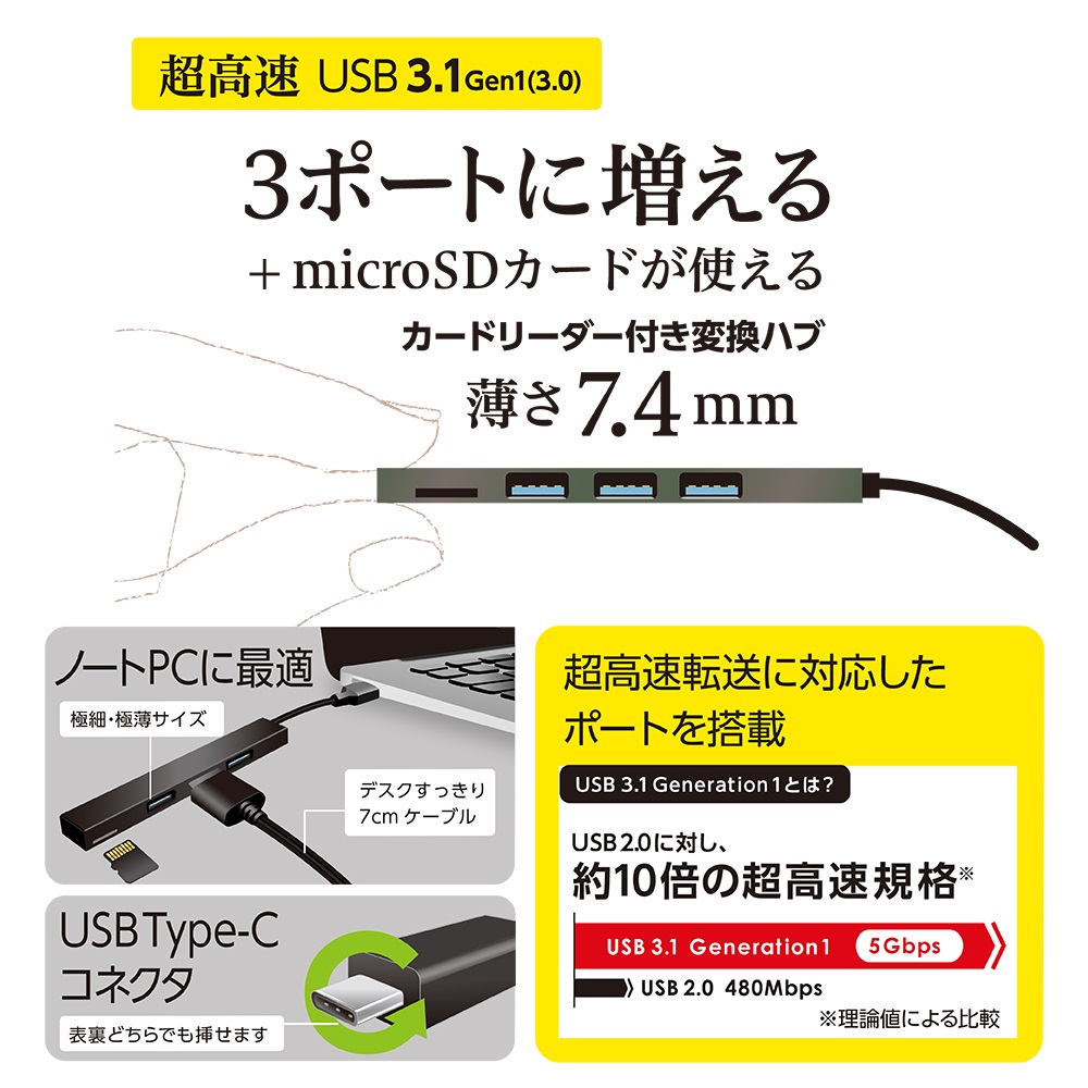 変換USBハブ。PCのポート数を増やしながらUSB機器(Type-A)を接続できます。