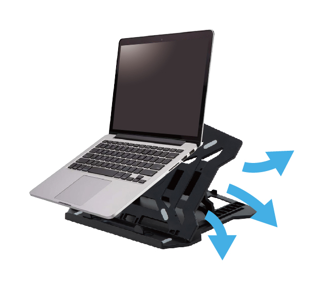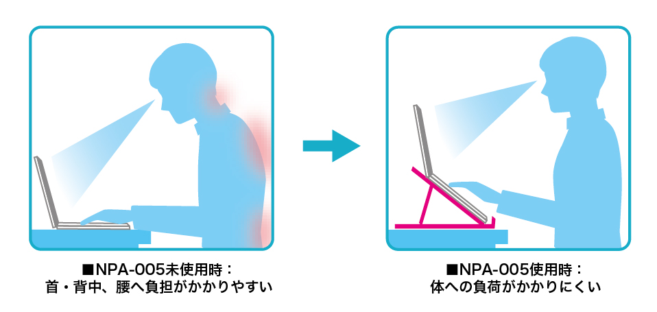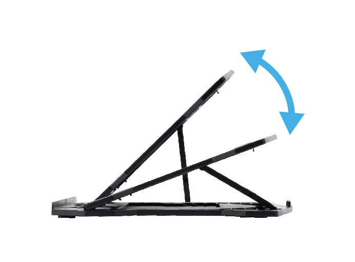 - 目線が低くなりがちなPC操作時の画面角度を調節して、体にかかる負荷を軽減できる