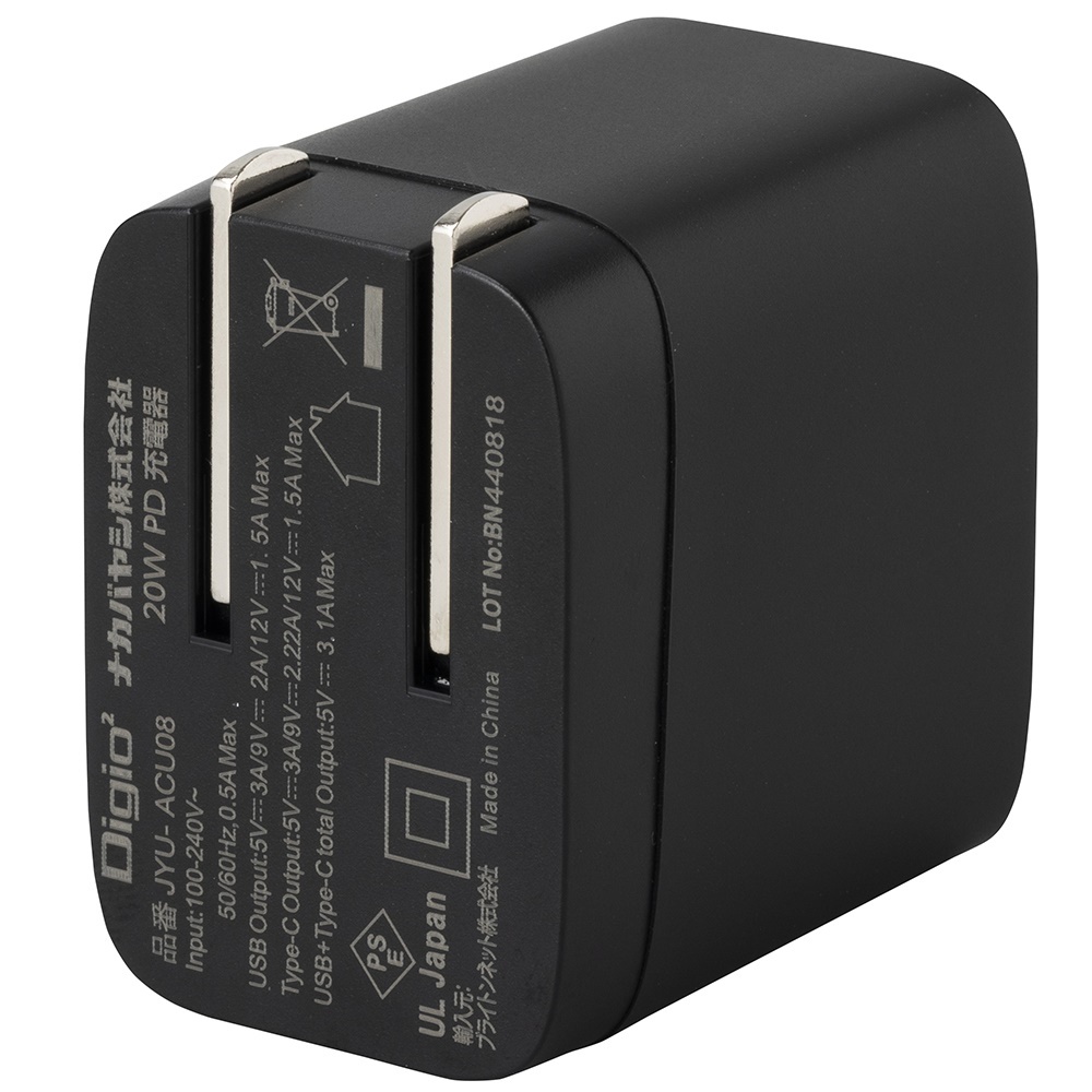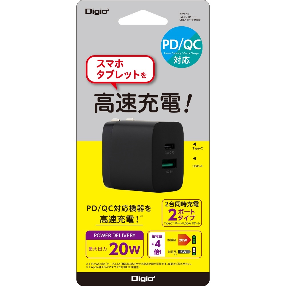 20W PD充電対応 Type-C 1ポート+USB-A 1ポート充電器/ブラック